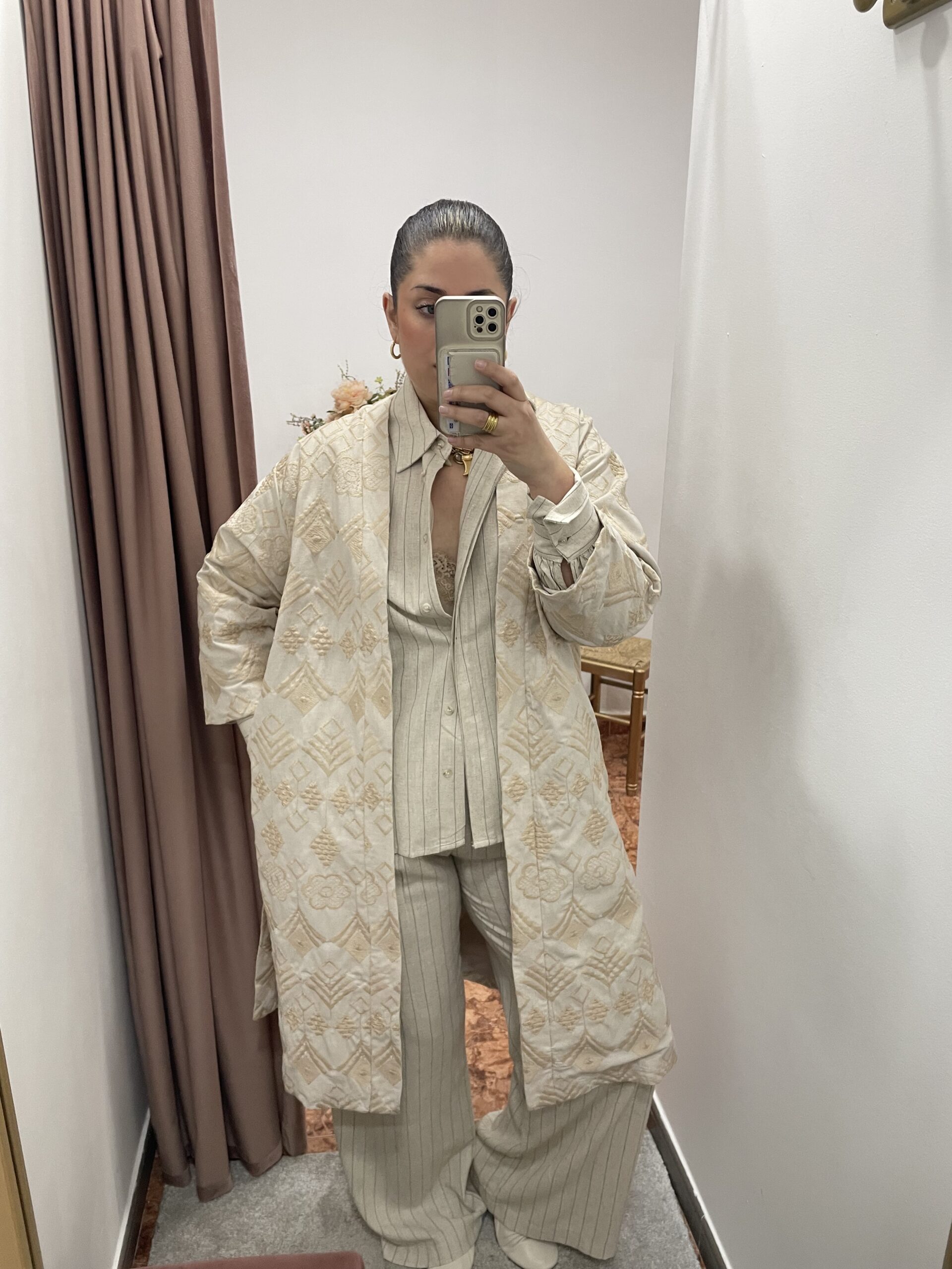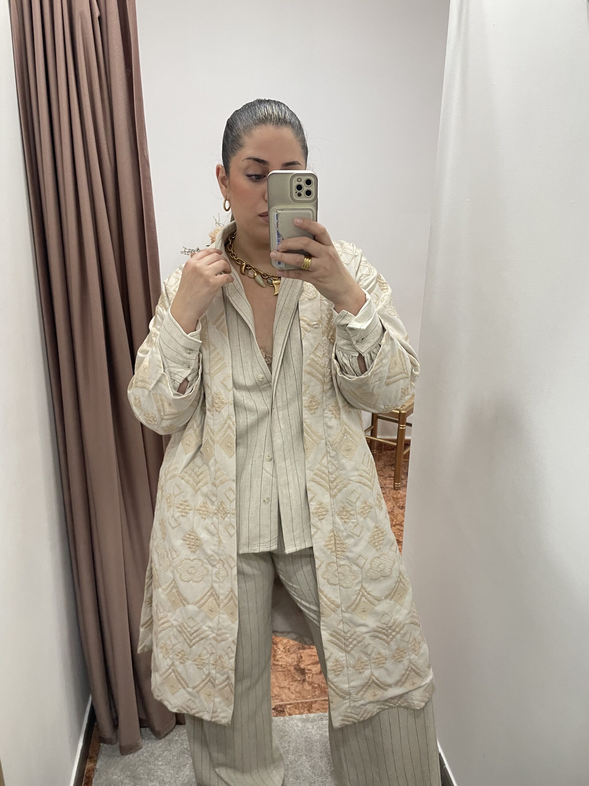 Para un look de impacto, llévalo como pieza central sobre el conjunto de lino pinstripe a juego. Para una opción de noche más audaz, combínalo con un vestido ajustado de seda o un conjunto de culottes y crop top en tonos neutros, realzado por tus joyas doradas favoritas.