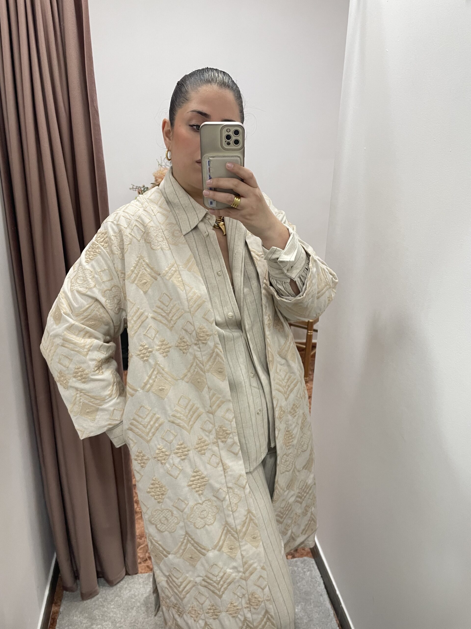 • Versatilidad Elevada: Sin cierres y con mangas de corte generoso, es ideal para combinar tanto con el conjunto a juego (como en la imagen) para un look total coordinado, como con unos jeans básicos para un estilo más informal pero distinguido.