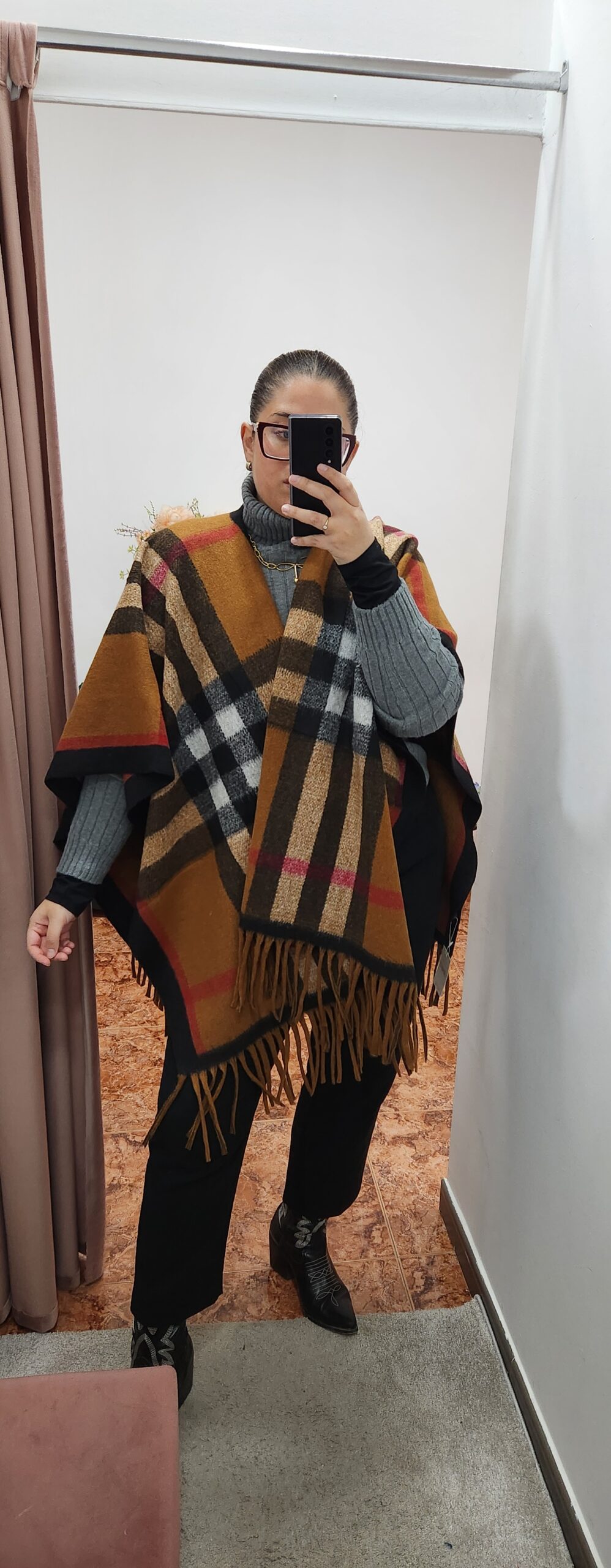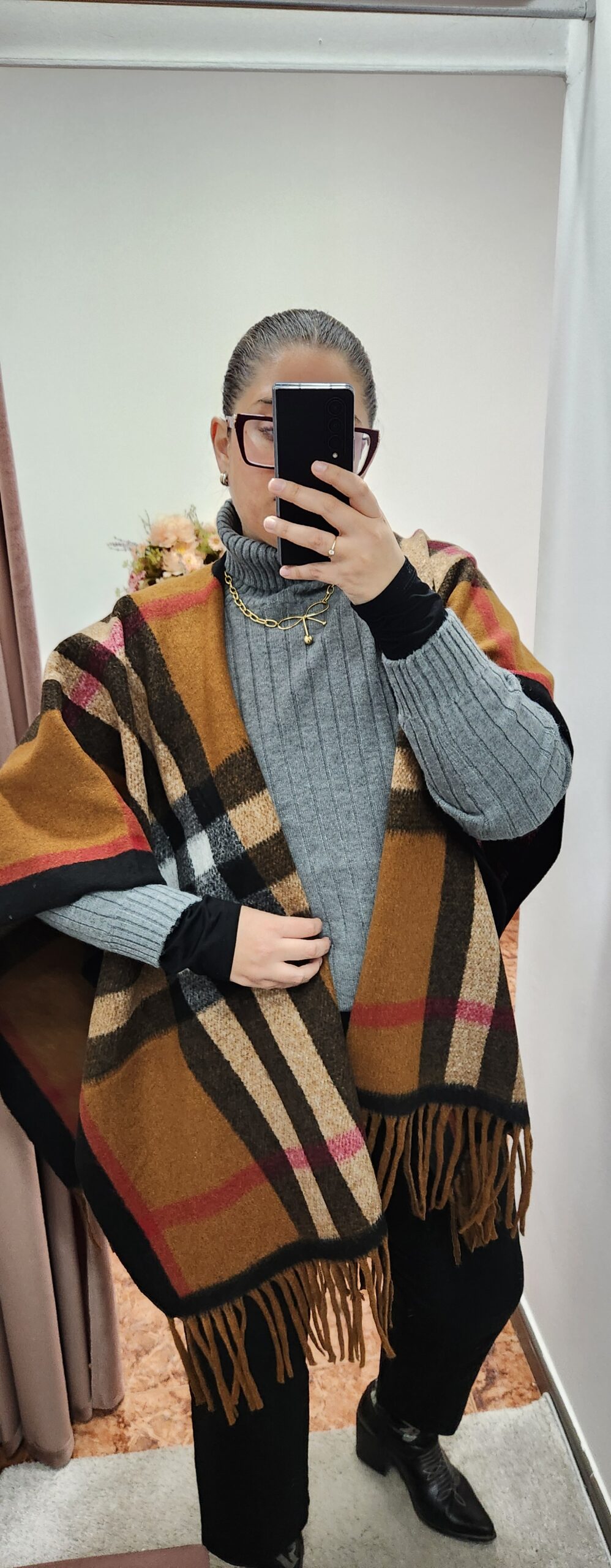 Capa en punto suave con tejido de cuadros